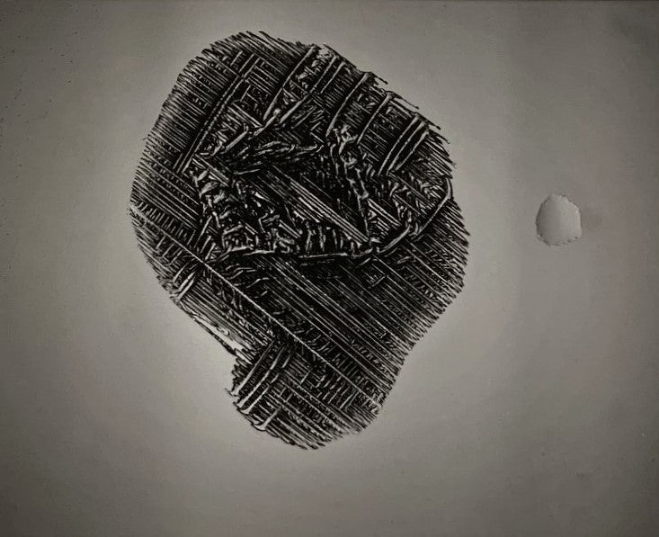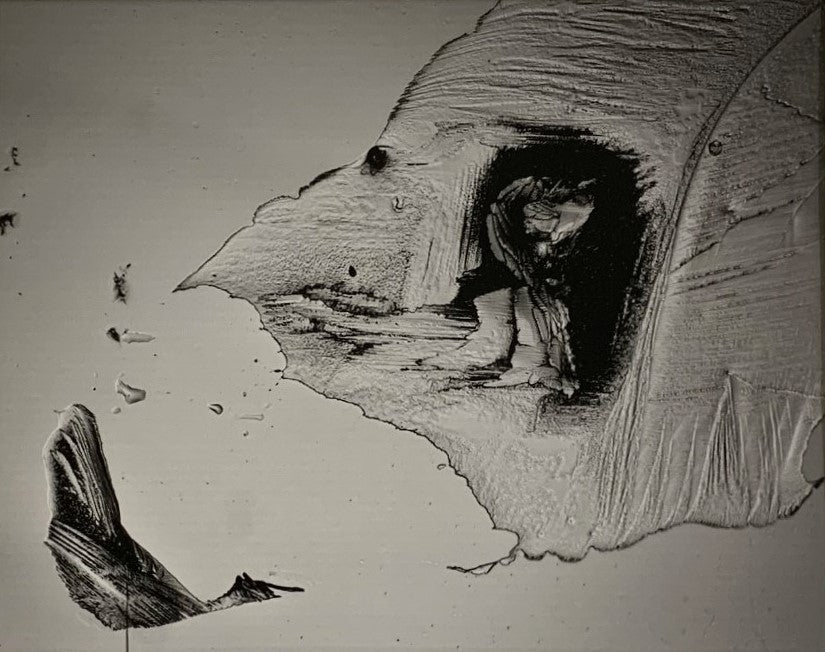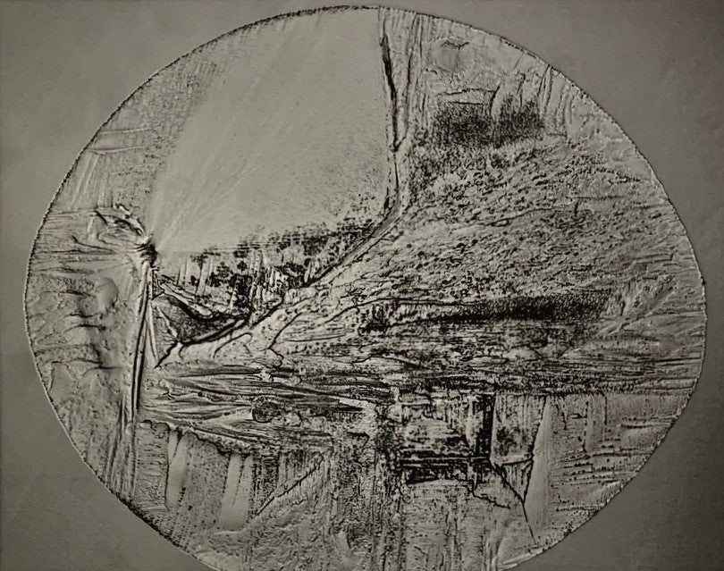 This moonscape-like scene smaller than 1.0 mm. There is a woman face set into the landscape, just as that famous photo “Face On Mars”.
